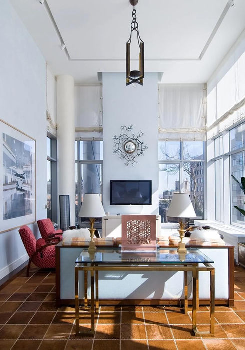 For a bright, fresh feel in this airy New York City penthouse designed by Robert Couturier, we created a custom Marmorino plaster applied throughout the home. The pale blue color of this finish imitates the sky, giving the atmosphere a sense of serenity.