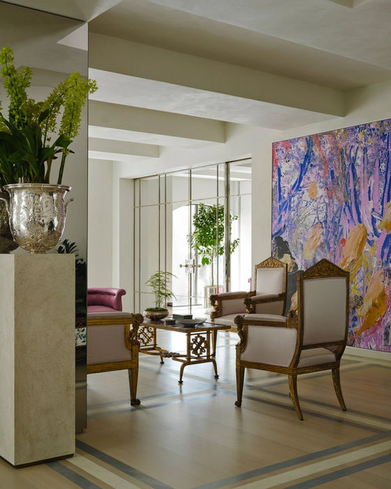 Tim Murphy painted accents in the master bedroom and dressing room that used the surrounding fabric as inspiration for faux finishes that would add various elements of texture, metallic sheen, and strié to tie the rooms together. The master bathroom's wall finish was installed by Patrick, who applied a warm, cream-hued Tadelakt plaster—ideal for high-moisture environments. Back in the dining room, he also created a polished plaster finish for the walls and ceiling with the appearance of shiny parchment. The adjacent salon and living rooms have a more subtle Marmoino finish throughout, while limewash covers the walls and ceilings of the gallery and entry rooms as well as the kitchen.