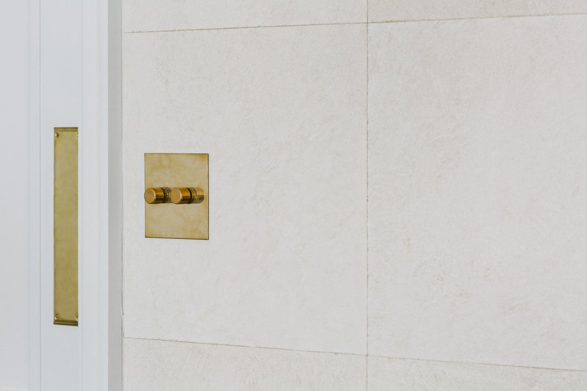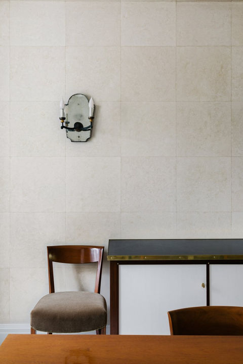 The faux parchment walls were painted by hand, revealing a subtle texture and warmth within the dining room. To add a more prominent texture, plaster fluting can be seen throughout the foyer in exquisite detail, showcased with the bench-run fluted panels and hand-cast ceiling coves.